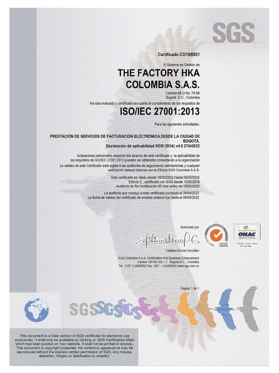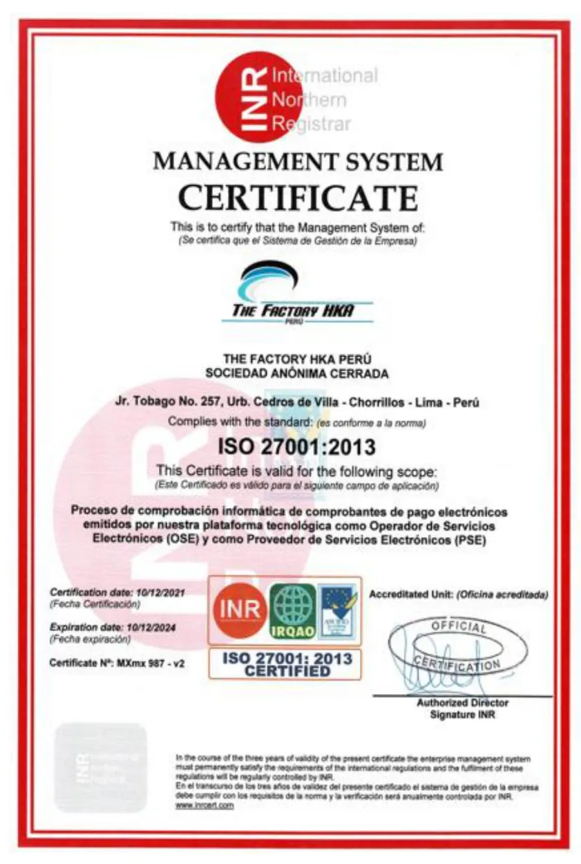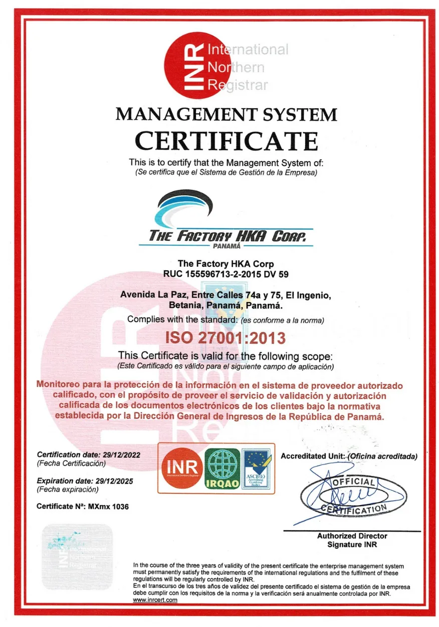 En The Factory HKA República Dominicana entendemos que la confianza es la base de toda relación comercial. Por eso, trabajamos bajo el estándar internacional ISO 27001, que garantiza la seguridad de la información y el cumplimiento de altos estándares de calidad.